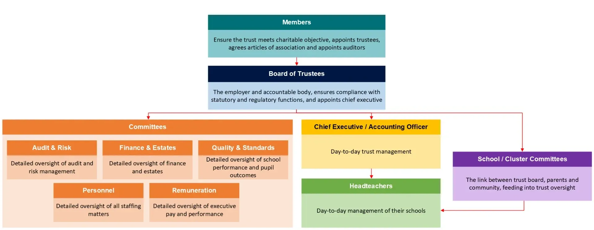 Governance is led by the Trust Board, supported by committees with responsibility for education, personnel, finance and estates, and audit and risk. Local School Committees provide important school-level insight, support and challenge.